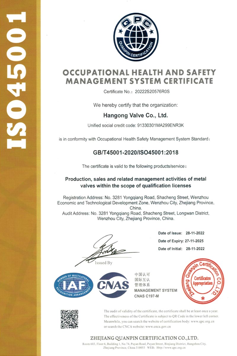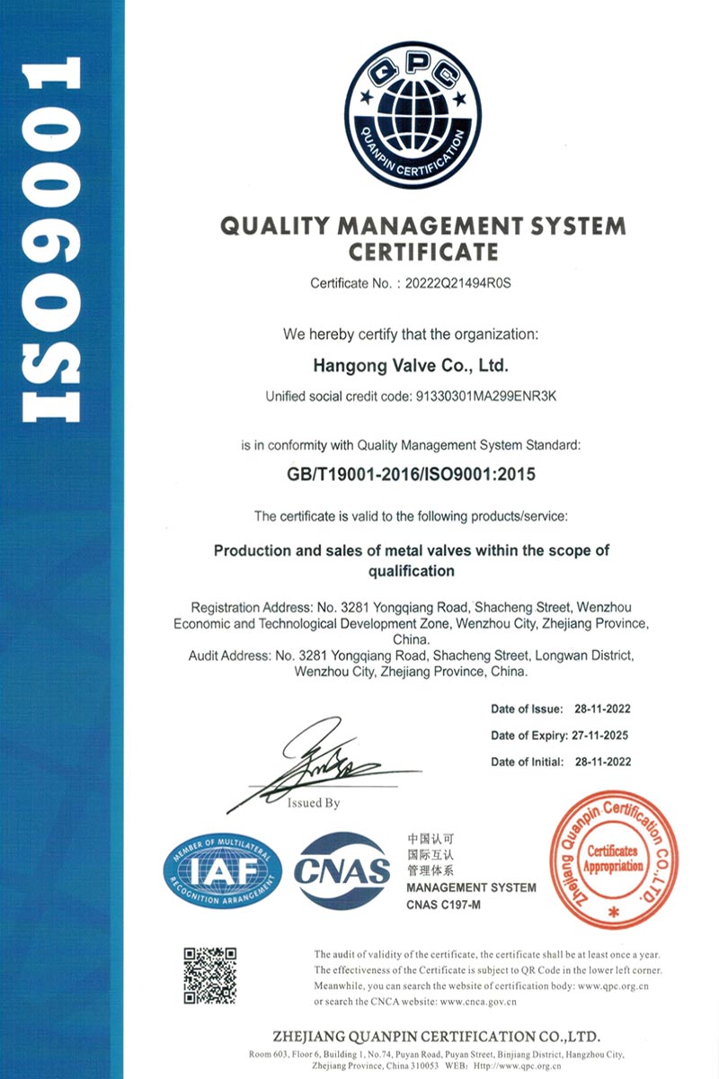 The company is equipped with CNC processing equipment, ordinary machine tools, precision vertical and horizontal lathes. Advanced testing equipment includes valve test bench, chemical composition analysis, metallographic analysis, mechanical performance test, hardness test, wall thickness measurement and so on. There are more than 100 sets (sets). Excellent equipment, exquisite technology and CAD which has been established for a long time. The R&D and design center and the enterprise information management system integrating e-commerce, technology support and service functions ensure the excellent quality of products. The company's leading products are butterfly valves, ball valves, fully welded ball valves, multi-level hard sealing butterfly valves, welding butterfly valves and various non-standard butterfly valves, gate valves, globe valves, check valves. The products are produced according to GB, API, ANSI, JIS, DIN, JB, BS, etc. The materials are stainless steel, cast steel, carbon steel, alloy steel, ultra-low carbon stainless steel, titanium steel, high nickel alloy and Monel alloy, etc. The diameter of the valve is 15mm-2000mm, and the annual production capacity of the valve is more than 10000 tons. Driving mode adopts manual, electric, pneumatic, gear transmission and other devices. Our products are widely used in petroleum, chemical, petrochemical, paper-making, mining, metallurgy, power, pharmaceutical, liquefied petroleum gas, water supply and drainage, mechanical equipment supporting, fire protection, urban construction and other fields. the company has passed ISO 9001:2008 international quality management system certification, ISO 4001:2004 environmental management system certification, GB/T 2800 1-2001 occupational health and safety management system certification, China Special Equipment Manufacturing License (TS), China Petrochemical Equipment. Membership units of industrial associations, qualified suppliers of China Chemical Group Corporation, group suppliers of China Huaneng Group Corporation, suppliers of China Huaneng Group Corporation, group members of China Urban Gas Association, members of China Construction Metal Structure Association, famous brands of China, etc. The quality assurance system is the backing force for the design, development, manufacture, sale and service of Han Gong valves, which ensures the quality and brand of Han Gong valves.